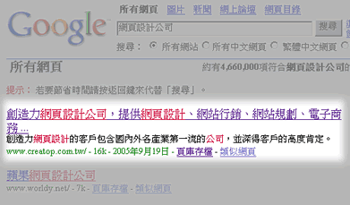 您可以參考以下網址,可以發現創造力在Google 中以--網頁設計公司--的這個關鍵字來搜尋,創造力的網站排名第一或是第二,証明我們所言不需。